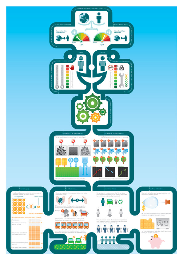 This graphic was produced by my own non-profit design studio in collaboration with graphic designer Angela Morelli. EcoLabs developed a brief based on ecological economist Herman Daly’s vision of a ‘steady state’ economic system and Angela Morelli transformed the concept into a stunning totem. A steady state system provides well-being for the population without economic growth and within the carrying capacity of the ecological system. What this means is that prosperity is created without harming the capacity of nature to sustain future generations. The graphic displays a hierarchy of ideas and illustrates a series of specific policy initiatives that would lead to social and environmental sustainability while limiting the power of the financial system. Examples of policy initiatives illustrated include the creation of maximum incomes to prevent increasingly polarised income disparities. EcoLabs is not promoting this steady state system as a future utopia (as we recognize that it has its own problems). Instead we use the model as an educational tool and speculative model for re-imagining social relations and economic systems designed for greater social justice and environmental sustainability. Download the Pdf here.